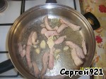 Нарезанное брусочками мясо свинины обжариваем на сливочном масле 2-3 минуты, затем добавляем чеснок, обжариваем 1 минуту и помещаем содержимое в горшочек на дно.
