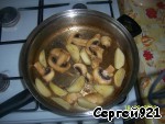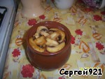 Укладываем сврху несколько ломтиков обжаренных шампиньонов, добавляем бульон и ставим горшочек, закрытый крышкой, в разогретую духовку на 25-30 минут.