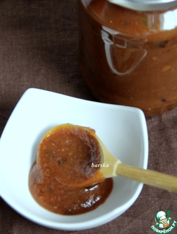 После дать нашей массе немного остыть. Перелить в блендер и измельчить в пюре. Вернуть снова в кастрюлю, добавить сахар (я положила в начале 0.5 ст. сахара), уксус и все специи. Снова довести до кипения и варить на маленьком огне еще минут 40. Перед окончанием варки рекомендую попробовать на вкус (я добавила еще немного сахара и соли).