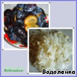 Сливы, чеснок, лук и имбирь переложить в кастрюлю, налить 1 стакан воды. Довести до кипения, уменьшить огонь и варить минут 30.