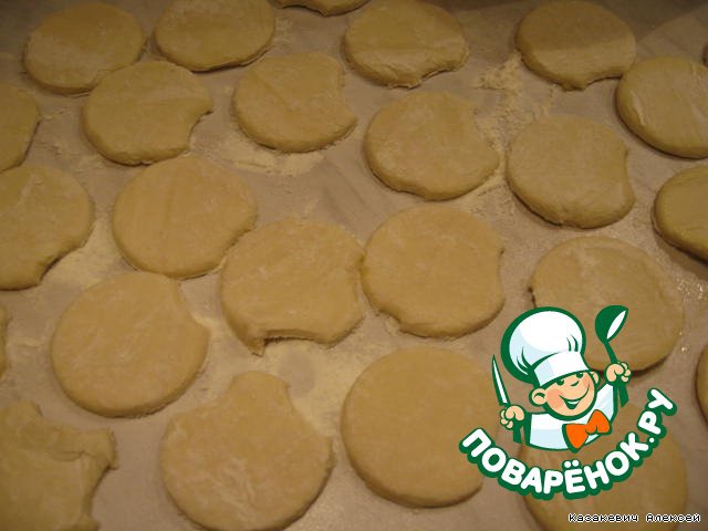 Посыпаем стол мукой, выкладываем тесто, сверху посыпаем мукой, раскатываем. Из раскатанного листа стаканом вырезаем кружочки диаметром 4-5 см.