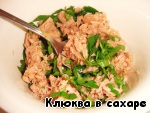 В отдельной мисочке разминаем вилкой консервированный тунец, перемешав его с рубленой петрушкой.