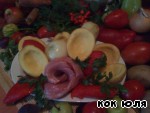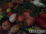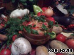 Овощи (баклажан, помидор, лук, перец) нарезаем соломкой, солим.