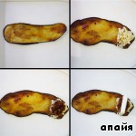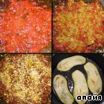 Разогрейте на сковороде масло и потушите помидоры 5 минут. Добавляем фарш и обжариваем, затем перчим, солим и добавляем измельченные в блендере орехи, и все обжариваем минут 5-7. Баклажаны обжариваем да золотистой корочки.
