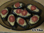 Начиняем получившейся начинкой наши баклажанчики, сверху выкладываем кружочками помидоры.