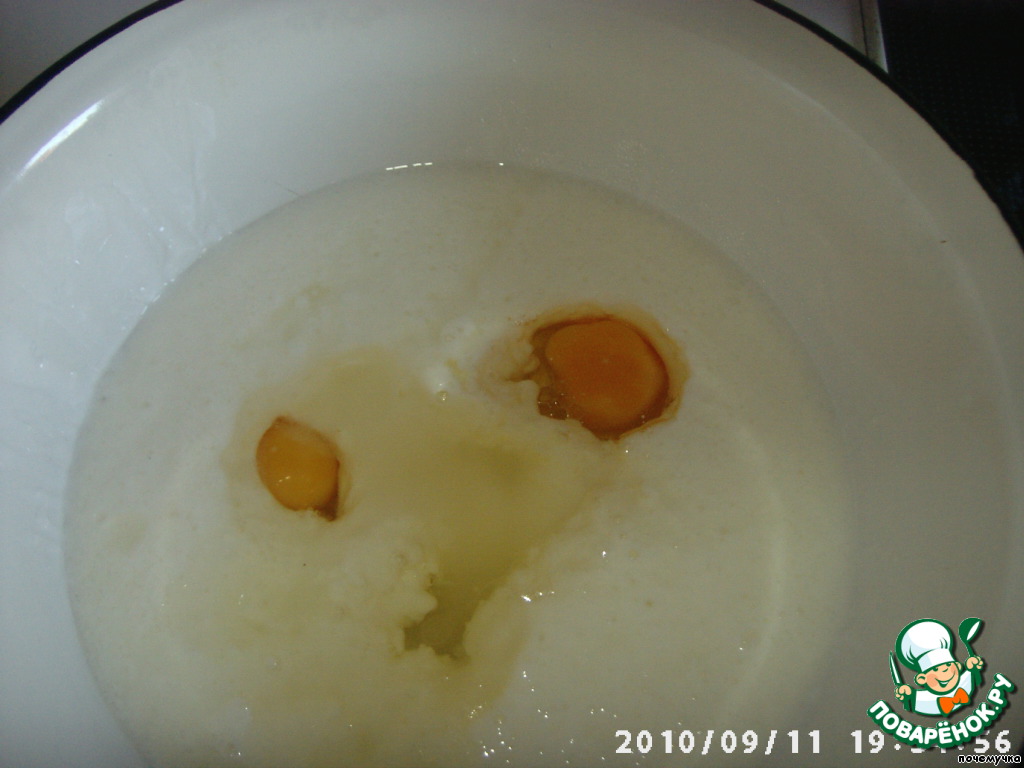 В кефир добавим яйца, соль, масло растительное, сахар и хорошо венчиком вымешаем