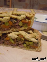 Дать отдохнуть 10 минут и вынуть из формы. Пирог хорошо держит форму. Куски не разваливаются и начинка не расползается. Подавать с бульоном или просто с горячим чаем.