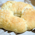 Застелем противень бумагой для выпекания, немного посыпем мукой, в центр поставим что-нибудь круглое - миску или банку диаметром сантиметров 15. Миску-банку предварительно так же посыпем мукой, чтобы бублик к ней не прилип.