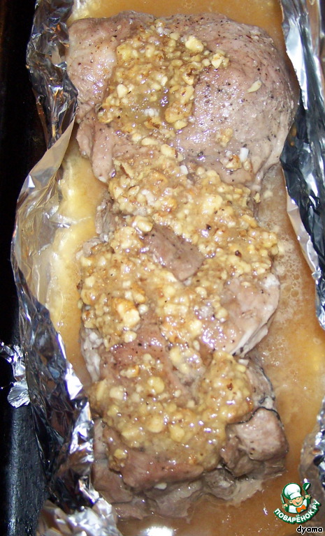 Мясо вынуть из духовки, фольгу развернуть, верх "косички" смазать медом с орехами и поставить в духовку еще на 15-20 минут.