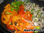 Овощи нарезаем соломкой и обжариваем до мягкости, добавляем овощи из маринада, доводим до готовности.