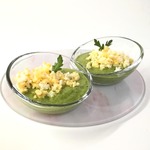• Очищаем варёное яйцо и разминаем его вилкой. Полученной крошкой посыпаем крем-суп сверху.