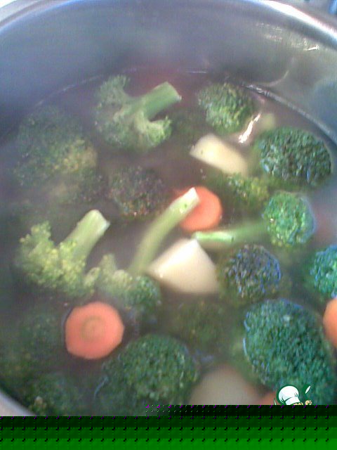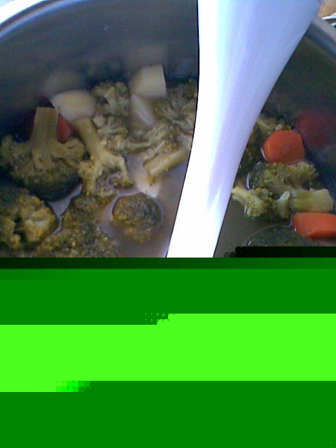 До такого состояния. Готовое овощное пюре влить в бульон - дать закипеть.