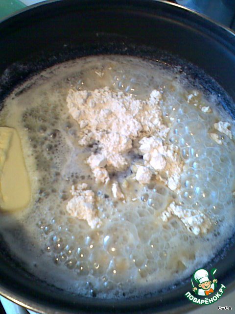 Теперь готовим соус - на сковороду кладем сливочное масло, зажариваем на нем муку, заливаем холодным молоком или сливками - доводим до загустения.