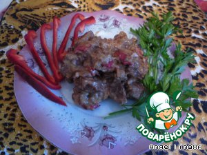 К мясу добавить приготовленный соус, немного посолить. Протушить под крышкой минут 20.