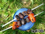 Подготовленные овощи нанизать на шампуры, как показано на фото. Они должны быть нанизаны так, чтобы при укладке шампура на мангал из овощей не вывалился фарш.