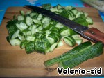 Огурцы разрезать на 4 части и нарезать тоненькими пластинками.