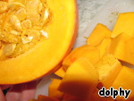 Тем временем очистить тыкву и нарезать крупными кусками (примерно 3 см).