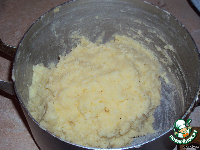 Картофель отварить в подсоленной воде, затем слить воду, помять. Немного остудить. Добавить тёртый сыр, 2 яйца, выдавленный чеснок, поперчить.