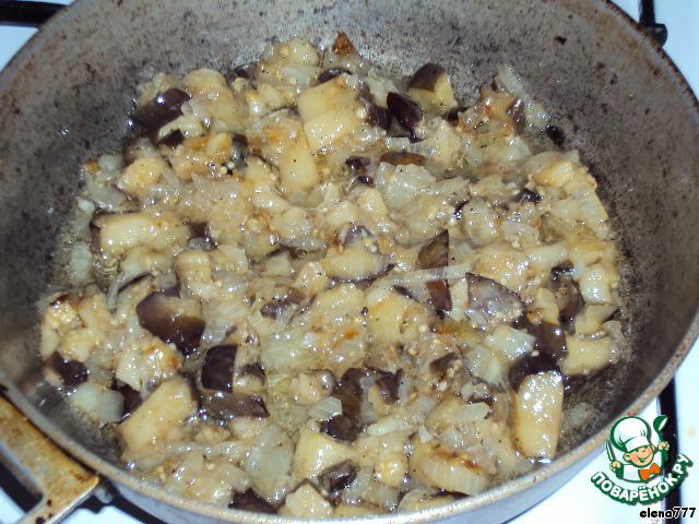 Баклажаны нарезать кубиками, лук - небольшой соломкой. Вместе их обжарить на растительном масле. В конце жарки чуть поперчить (солить не надо) и добавить грибной кубик (по желанию, можно не добавлять), перемешать, начинку остудить.
