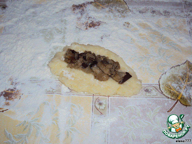 Стол присыпать мукой. Выкладывать на стол понемногу картофельный фарш, прижать рукой, делая небольшую лепёшку, сверху выложить начинку, отжимая ложкой от масла.