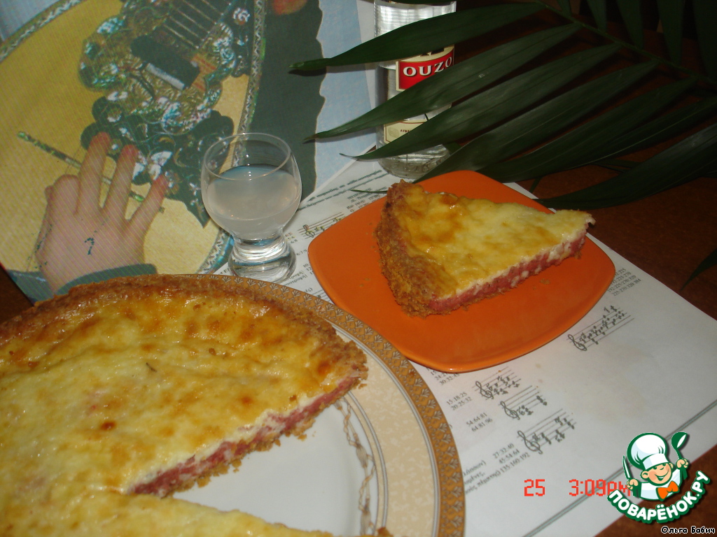 • На остывшее тесто (будем так его называть) укладываем сосисочный фарш.