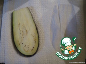 Обсушенные таким образом баклажаны поджарить до золотистой корочки с обеих сторон, выложить на бумажное полотенце, промокнуть, чтобы убрать излишки масла.
