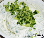 Фету размять, добавить сок лимона, оливковое масло, черный перец, огурцы нарезать мелкими кубиками.