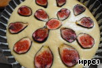 В смазанную и посыпанную сухарями форму 24 см выложить тесто, сверху выложить половинки инжира срезом вверх и прижать.