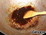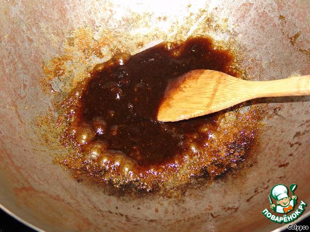 На той же сковороде жарим неочищенный сахар (маскавадо) до получения карамели. Лучше использовать именно неочищенный тростниковый сахар, любой Вам доступный, от жёлтого до черного. Из-за особого вкуса и аромата меласы, которого рафинированный сахар уже не имеет.