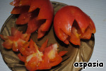 Пока все вместе лежит на теплой сковороде, готовим помидорные корзиночки - фигурно вырезаем края, оставляя "цветы "для украшения блюда. Вынимаем серединку помидора.