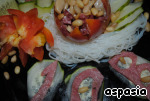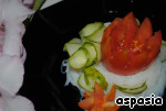 Украшаем блюдо тонкими пластинками огурцов, цветами из помидор и лепестками из огурчиков и мяса.