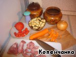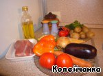 Помидоры предварительно очищаем от кожицы, поместив их – с крестообразными надрезами на кожице – на 10-20 сек вкипяток. Мясо моем, нарезаем некрупными кусками, овощи моем, нарезаем кубиками (морковь чуть мельче других овощей). Баклажаны помещаем в соленую воду на 10-15 минут (чтобы избавить от горечи), затем вынимаем и отжимаем тканной салфеткой. Трем сыр. Мелко рубим чеснок.