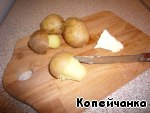 Отвариваем до полуготовности мелкий картофель в мундире. Вырезаем «шляпку», оставив на ней кожицу, обрабатываем «ножку», смазываем весь «грибок» сливочным маслом. Также поступаем со следующими и помещаем все во второй горшочек.