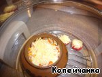 Выливаем из горшков воду. В один наливаем на дно 1-2 ложки рафинированного оливкового масла, выкладываем баклажаны, затем морковь, добавляем немного солим и смесь 4-х перцев. Следующий слой лук, мясо, немного рубленного чеснока, снова поперчим, затем кубики томатов, чуть солим и перчим и, наконец, выкладываем сладкий перец, посыпаем тертым сыром с чесноком и закрываем крышкой.
