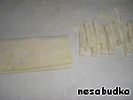 и раскатать очень тонко, хорошо посыпая мукой. Свернуть рулетом и нарезать полосками. Разложить лапшу на посыпанной мукой поверхности и дать подсохнуть (если не будете варить всю лапшу сразу).