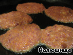 Фарш снова хорошо перемешать и жарить котлеты на растительном масле, наливая каждую порцию ложкой, так как фарш полужидкий. Котлеты нужно прожарить хотя бы по два раза с каждой стороны, чтобы мясо внутри не оставалось сырым.