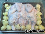 Противень смазать немного маслом, выложить на него цыпленка, обмазать приготовленным соусом. Вокруг цыпленка выложить картофель, на каждый картофель положить по кусочку сливочного масла. Поставить в разогретую духовку. Выпекать до корочки (у меня блюдо стояло в духовке полтора часа).