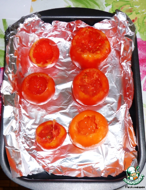 Помидоры помыть. Срезать крышечки и вынуть ложкой серединку и семена.