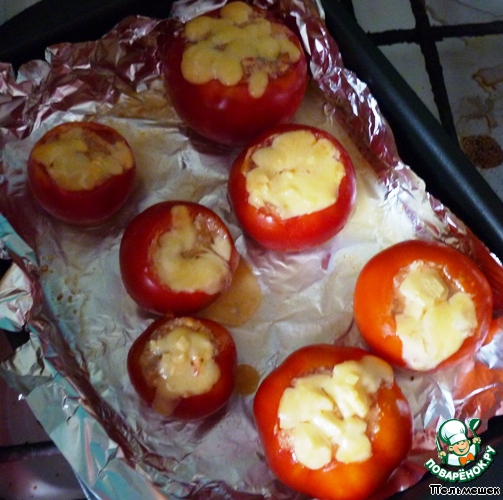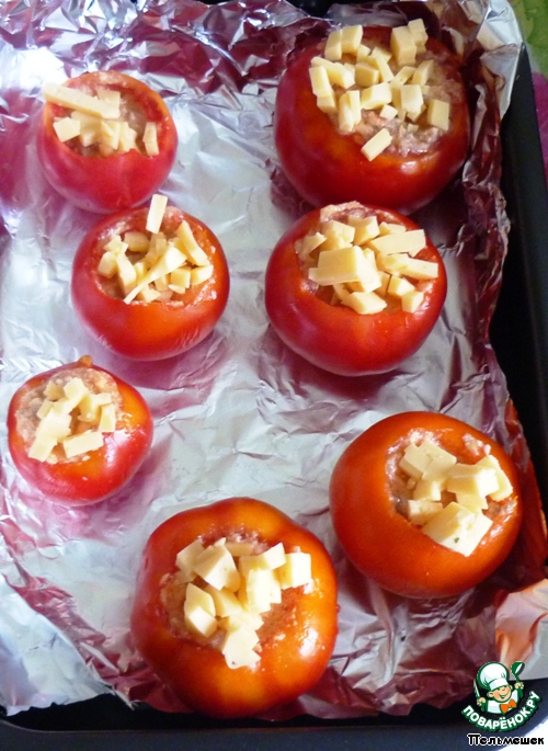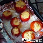 Яйца отварить и мелко нарезать. Смешать яйца с фаршем. Заполнить помидоры.