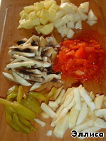 Картофель очищаем и нарезаем кубиками, также очищаем грибы и шинкуем.