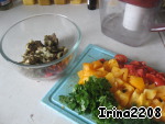 В оригинале: кабачок и баклажан порезать кубиками и обжарить на сковороде. Помидоры и перец порезать произвольно. Я сделала так: баклажан и перец положила на смазанный маслом противень и в духовку. Потом с баклажана сняла кожицу и порезала, перец просто порезала, помидоры порезала сырыми, зелень мелко нарезала и чеснок пропустила через чеснокодавку.