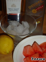 Арбуз очищаем от кожицы и косточек, нарезаем маленькими кусочками. Бокал "Маргарита" заполняем льдом.
