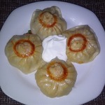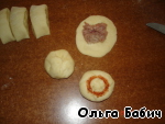 Каждый кусочек раскатать, положить фарш, собрать узелком, как собираем тесто на хинкали.