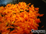 Корте отправляемся за морковью. Моем, чистим, мелко ровно нарезаем.Слегка обжарим на чистой (нам нужны чёткие яркие цвета) сковороде в масле. Добиваемся, чтобы морковь закрепила в масле свой цвет.