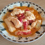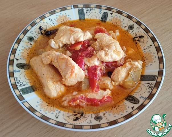 Готовое блюдо перекладываем на тарелки, полив кокосово-пряным соусом. Подаём горячим.