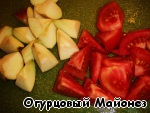 Яблоко очищаем от сердцевины (кожицу не снимаем) и вместе с помидором режем на "полудольки", которые по размеру должны быть примерно равны кусочкам индейки.