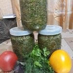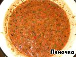 Чтобы зелень и чеснок измельчались равномерно, прокручивайте их вместе с помидорами, так будет легче.