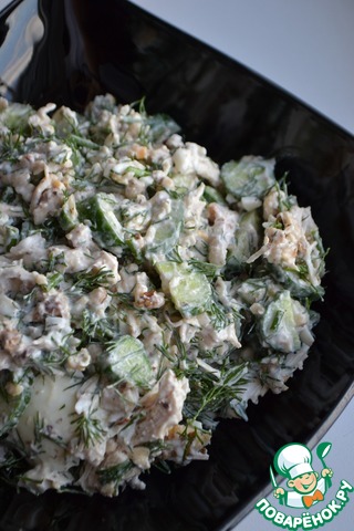 Сытный салат! Мне понравился! Мясо - отварная куриная грудка с кожей; майонез заменила на натуральный йогурт; зелень - укроп; орехи не обжаривала, слегка измельчила блендером; яйца натерла на терке. Грудку я отваривала заранее, за день до приготовления салата.