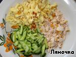 Курицу и огурцы порезать брусочками. -
