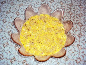 Посыпать тёртыми грецкими орехами, сверху выложить тёртый сыр и промазать соусом.